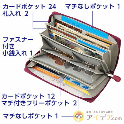 ■材質 表地:合成皮革(ポリウレタン) 裏地:ポリエステル ■製品サイズ(約) 21×11×マチ3cm(8.5×5.4cm以下のカードに対応) ■ポケット数 カードポケット36、マチなしポケット2、マチ付フリーポケット2、ファスナー式小銭入れ1、札入れ2、背面ポケット1 ■使用上のご注意 ●対応サイズ以外のカードは収納できません。