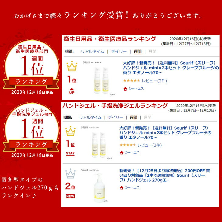 製品仕様 商品名 Sourif(スリーフ)ハンドジェル 27g 2本セット 内容量 27g/本 アルコール濃度 エタノール(溶剤)70% 成分 エタノール、水、グリセリン、ヒアルロン酸Na、加水分解コラーゲン、(アクリロイルジメチルタウリンアンモニウム/VP)コポリマー、グレープフルーツ果皮油、ゲラニオール 記載について グレープフルーツの香りとは、グレープフルーツ果皮油のことを指します。